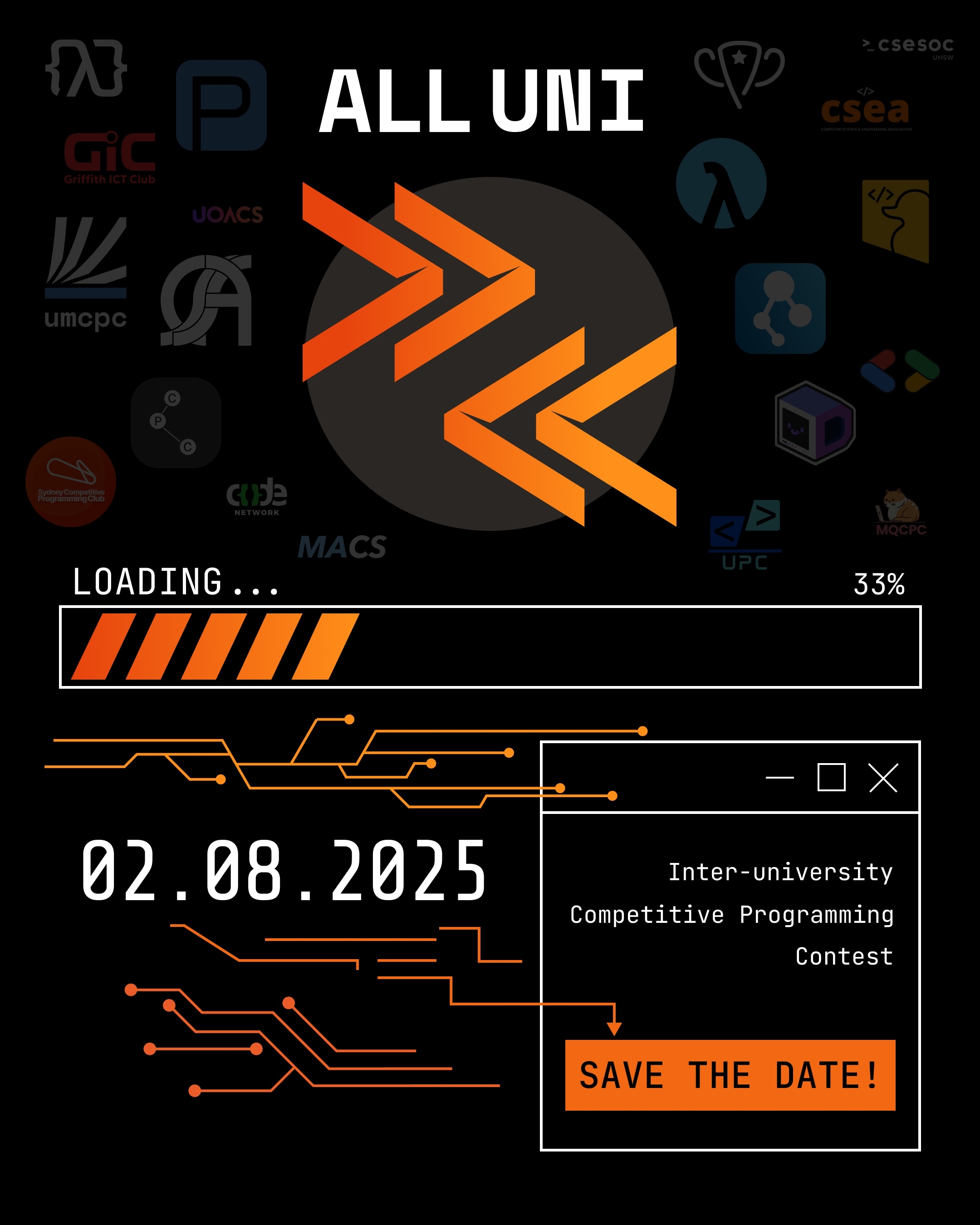 AllUni is an inter-university competitive programming competition for students across Australia and New Zealand! Create teams of up to three students to compete in an ICPC-style contest for the chance to win a variety of prizes, ranging from merchandise to a prize pool of $5000!